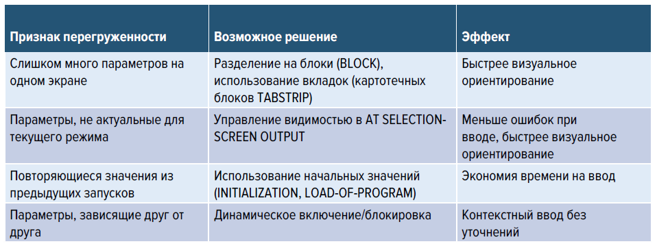 Дело в том, что большинство селекционных экранов создаются как статичные формы. Все поля видны сразу, независимо от ситуации. Проверки выполняются после нажатия кнопки «Выполнить» (Execute), то есть уже после того, как пользователь ошибся. Программа выполняет задачу, но не очень сильно помогает вводить данные правильно (даже если используются стандартные механизмы выбора допустимых значений).