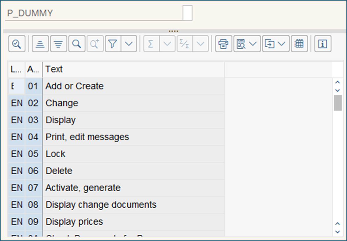 data : go_cont type ref to cl_gui_docking_container , go_grid type ref to cl_gui_alv_grid , gt type standard table of tactt . parameters p_dummy. initialization. select * from tactt into table gt where spras = sy-langu. at selection-screen output. if go_grid is not bound. go_cont = new #( repid = sy-cprog dynnr = sy-dynnr ratio = 85 side = cl_gui_docking_container=>dock_at_bottom ). go_grid = new cl_gui_alv_grid( go_cont ). go_grid->set_table_for_first_display( exporting i_structure_name = 'TACTT' changing it_outtab = gt ). endif.