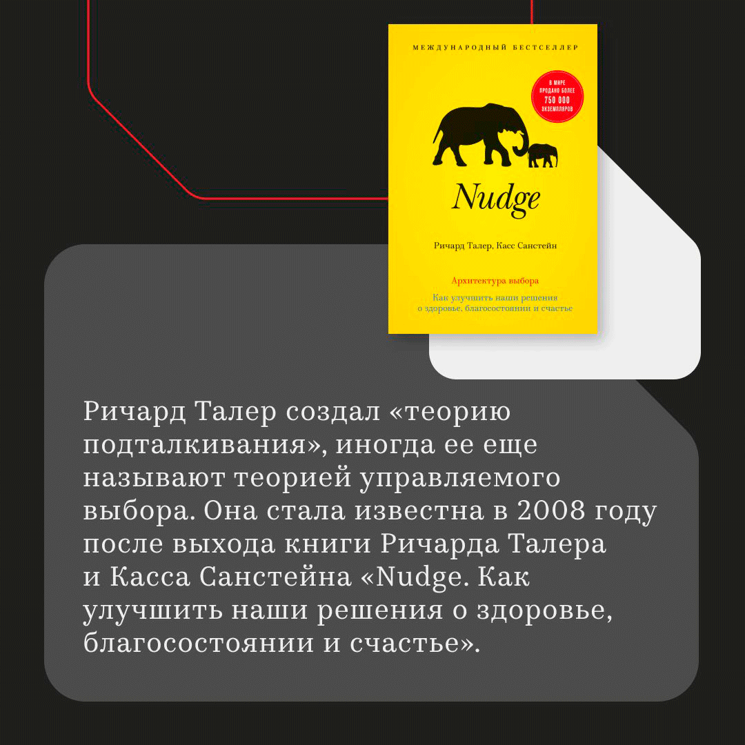 - Подталкивание (nudge) - мягкое влияние на выбор без запретов и наказаний.