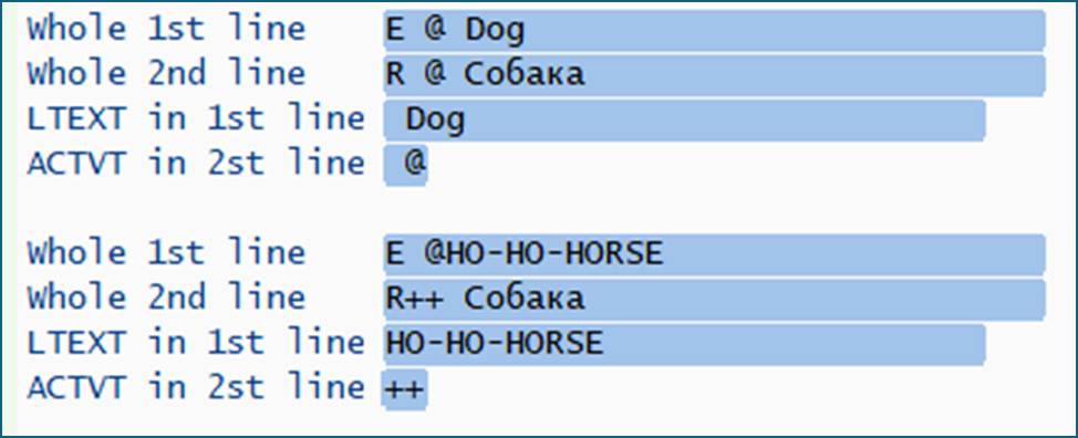 types tt_tactt type standard table of tactt with default key. DATA(gt) = VALUE tt_tactt( ( spras = 'E' aCtVT = ' @' ltext = ' Dog' ) ( spras = 'R' aCtVT = ' @' ltext = ' Собака' ) ). write: / 'Whole 1st line ', gt[ 1 ] color col_key , / 'Whole 2nd line ', gt[ 2 ] color col_key , / 'LTEXT in 1st line', gt[ 1 ]-ltext color col_key , / 'ACTVT in 2st line', gt[ 2 ]-actvt color col_key. gt[ 1 ]-ltext = 'HO-HO-HORSE'. data(i) = 3. skip. write: / 'Whole 1st line ', gt[ 1 ] color col_key , / 'Whole 2nd line ', gt[ 2 ] color col_key , / 'LTEXT in 1st line', gt[ 1 ]-ltext color col_key , / 'ACTVT in 2st line', gt[ i - 1 ]-actvt color col_key.