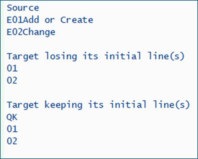 data: gt1 type standard table of tactt , gt2 type standard table of tact. start-of-selection. select * from tactt into table gt1 where spras = 'E' and actvt < '04'. write: / 'Source'. loop at gt1 into data(gz). write: / gz. endloop. skip. write: / 'Target losing its initial line(s)'. append 'QK' to gt2. MOVE-CORRESPONDING gt1 to gt2. loop at gt2 into data(gs). write: / gs. endloop. skip. write: / 'Target keeping its initial line(s)'. refresh gt2. append 'QK' to gt2. MOVE-CORRESPONDING gt1 to gt2 KEEPING TARGET LINES. loop at gt2 into gs. write: / gs. endloop.