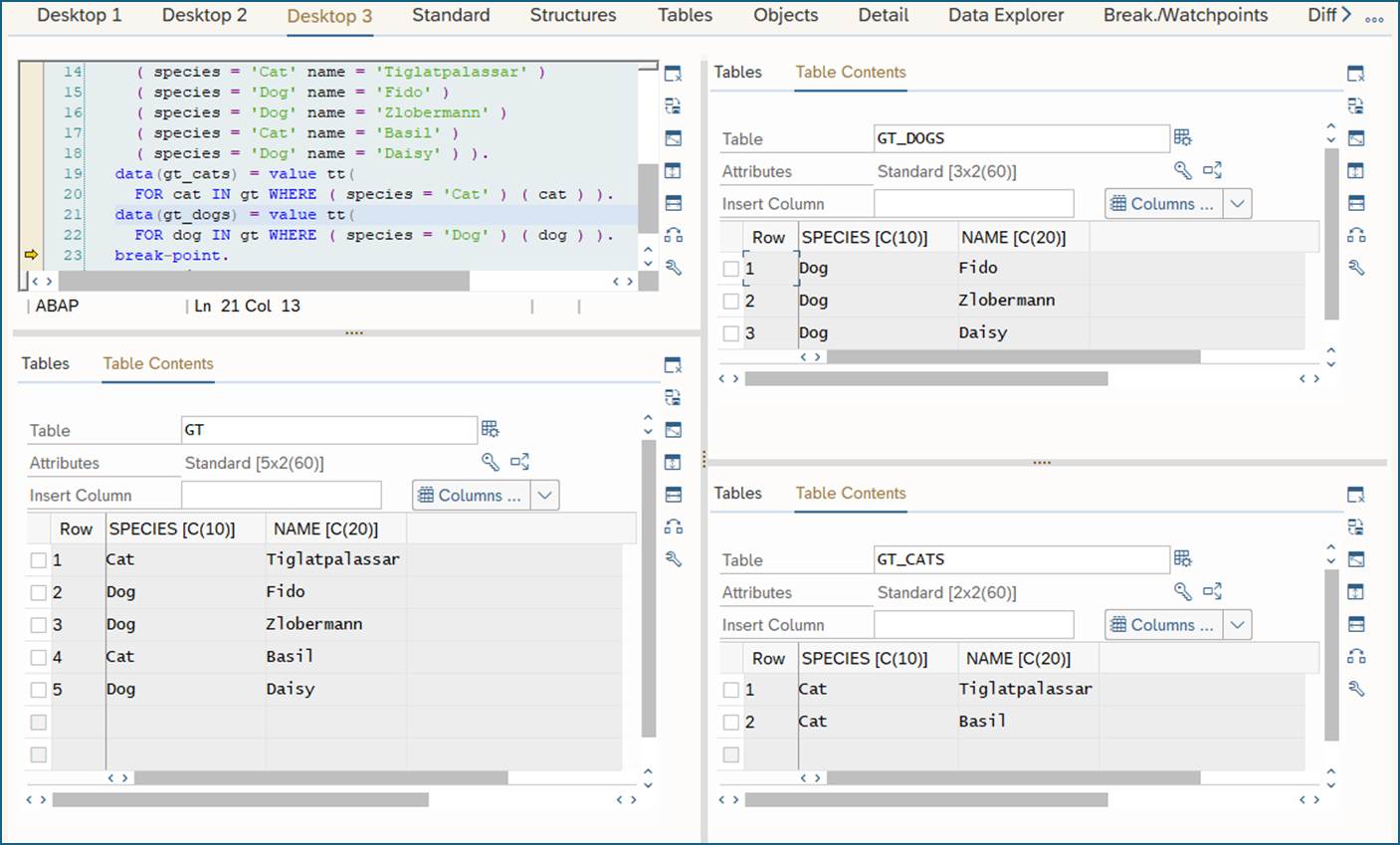 types: begin of ts_pet , species type char10 , name type char20 , end of ts_pet . types tt type standard table of ts_pet with empty key. start-of-selection. data(gt) = value tt( ( species = 'Cat' name = 'Tiglatpalassar' ) ( species = 'Dog' name = 'Fido' ) ( species = 'Dog' name = 'Zlobermann' ) ( species = 'Cat' name = 'Basil' ) ( species = 'Dog' name = 'Daisy' ) ). data(gt_cats) = value tt( FOR cat IN gt WHERE ( species = 'Cat' ) ( cat ) ). data(gt_dogs) = value tt( FOR dog IN gt WHERE ( species = 'Dog' ) ( dog ) ). break-point.